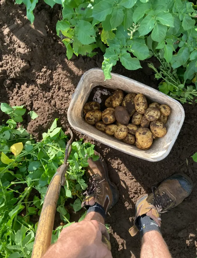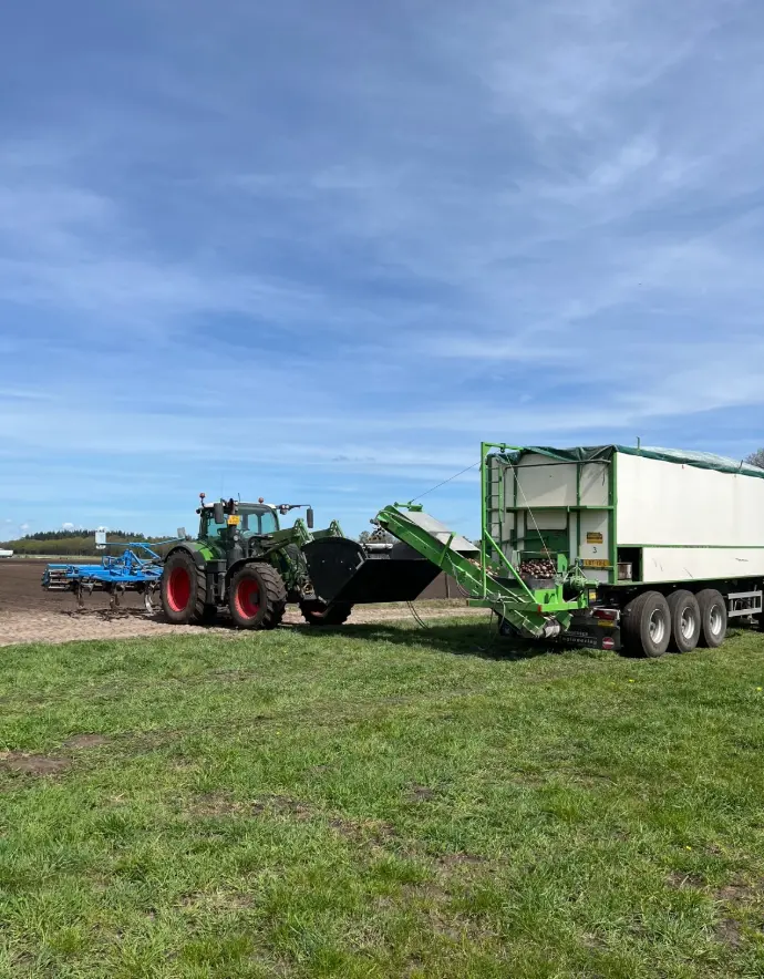 In augustus ging ik mee op bemonstering in de aardappelen. Hier worden gegevens zoals gewasstand, nitraatgehalte, knolgrootte en neerslag gemeten op het perceel om zo een volledig overzicht over het gewas te verkrijgen doorheen het groeiseizoen. Bemesting, beregening, gewasbescherming en oogsttijdstip worden zo bepaald. In het voorjaar van 2025 hielp ik mee tijdens het planten van aardappelen. Met een Fendt 724 met voorlader en cultivator bracht ik het pootgoed aan op het perceel en maakte ik de kopakkers los.
